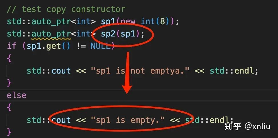 代码示例:使用auto_ptr时,拷贝或复值导致p1 持有的堆对象被转移给 sp2: