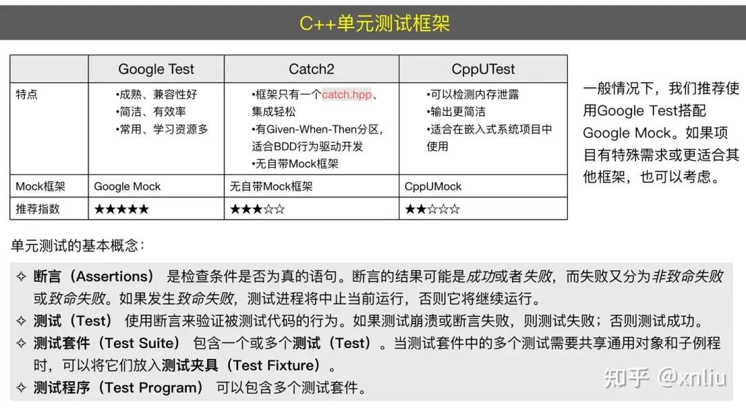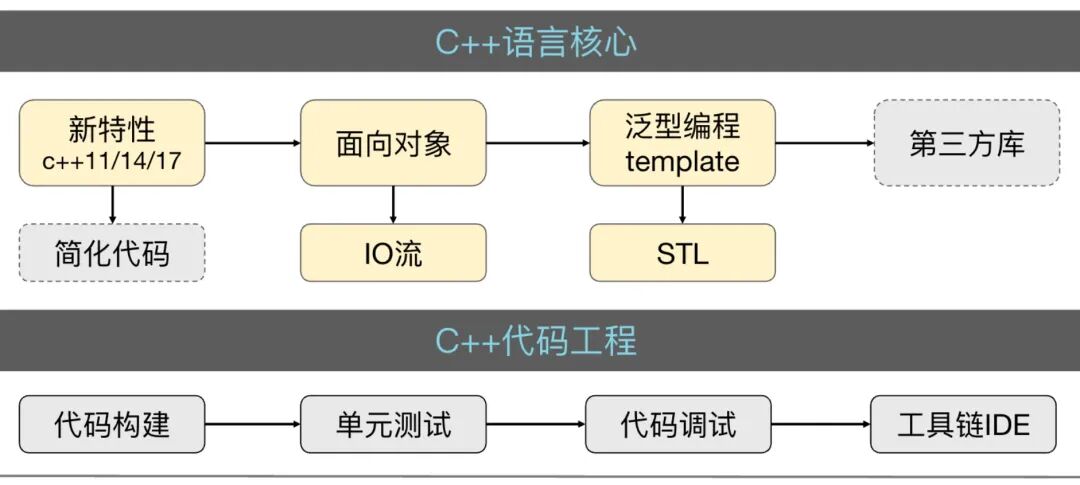 关于C++的语言核心:✧ 新特性:使用新特性有助于简化代码,提高编程效率。例如,一个auto关键字,合理使用可以大大降低大脑和手指的负担,大脑不用记住太多东西, 手指也可以少敲很多代码,体会一下这行代码:for(auto &it : vec) { ... } ✧ 面向对象:继承/多态/运算符重载是对象对象的核心特征,IOStream作为官方库标准库,是使用面向对象的典范 ✧ 泛型编程:基于template的编程,可能是C++最强大的地方,这是一种和面向对象完全不同的思维方式,STL是使用泛型编程的典范 ✧ 第三方库:编程语言要想发挥巨大作用,必须依赖第三方库,本文重点在语言内核上,对第三方库不做过多介绍 关于C++工程化:主要涉及代码构建,单元测试,代码调试,编程环境IDE