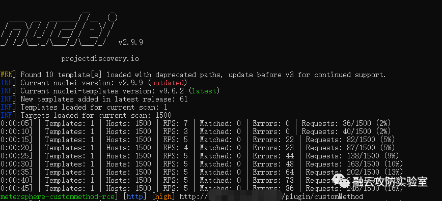 nuclei.exe -t metersphere-custommethod-rce.yaml -l subs.txt -stats(注:本文章为技术分享,禁止任何非授权攻击行为)