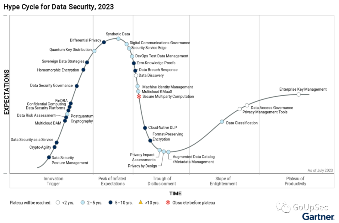 Gartner认为,应对量子计算威胁、安全工具的融合和集成以及管理未知的影子IT数据是当务之急。Gartner数据安全技术成熟度曲线新增的五项技术将帮助CISO做好应对下一代量子威胁的准备,同时应对治理和数据主权方面的重大挑战。下面简单总结一下新增的五项技术: