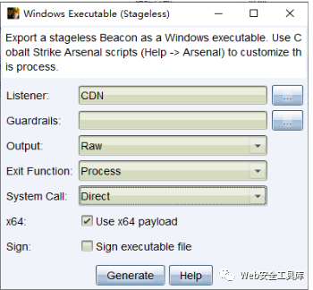 1、加密Shellcode,选择Stagerless,生成RAW格式。