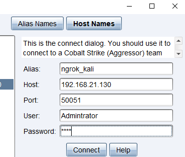 启动cs的客户端然后连接上本地kali启动的cs服务器。