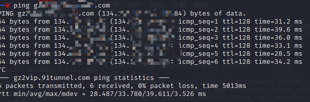 因为我们使用的tcp的隧道,所以是可以这样搞的,ping一下我们的tcp隧道的域名。
