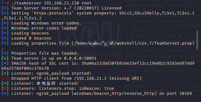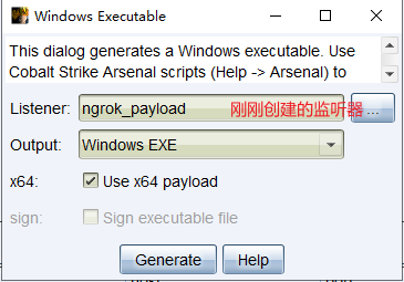 大概的流程就是将cs的服务端与ngrok公网IP建立隧道,建立两个监听器,使用公网IP的监听器生成后门,使用cs服务端的监听器接收shell。当后门运行的时候,它会去访问ngrok公网IP与端口,而这个公网IP与cs服务端建立了映射,它会转发到cs服务端的IP与端口上。这样不使用自己的vps也可以使用cs了。