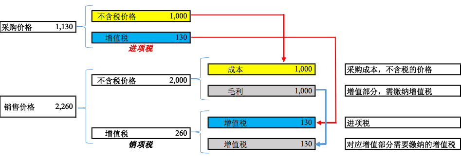 相应的,260元增值税也包括两部分,分别对应1000元成本计算的增值税130元(蓝色),实际上就是进项税,另外对应1000元(灰色)增值部分需要缴纳的增值税130元(灰色)。