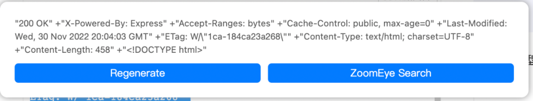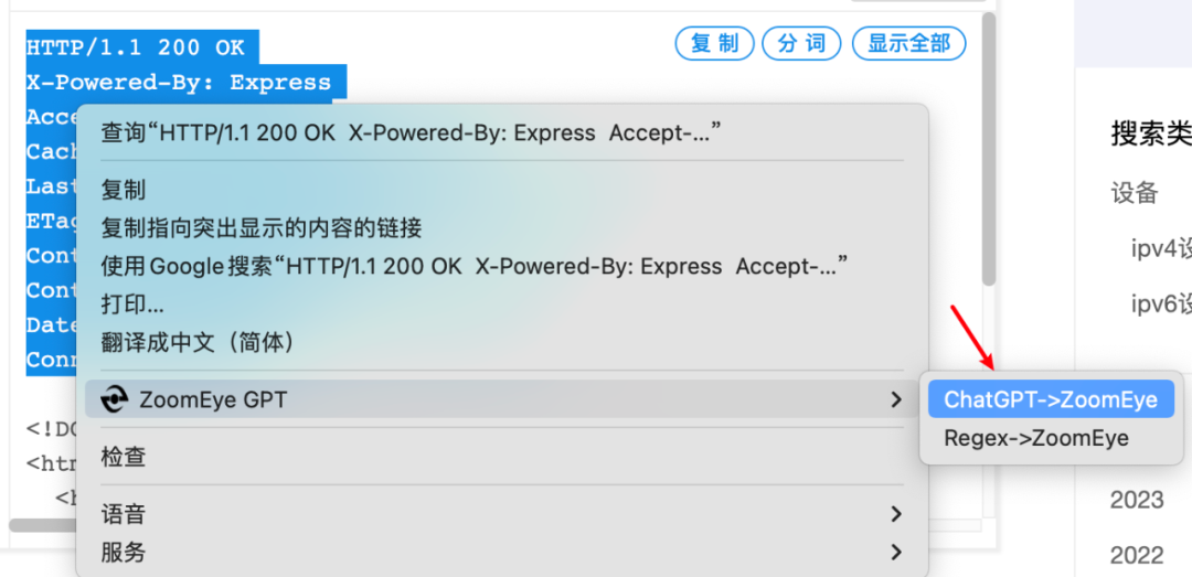 选中一段内容,右键找到ChatGPT -> ZoomEye,即可对响应体中的关键字进行提取,并生成 ZoomEye 搜索使用的语法。![]()