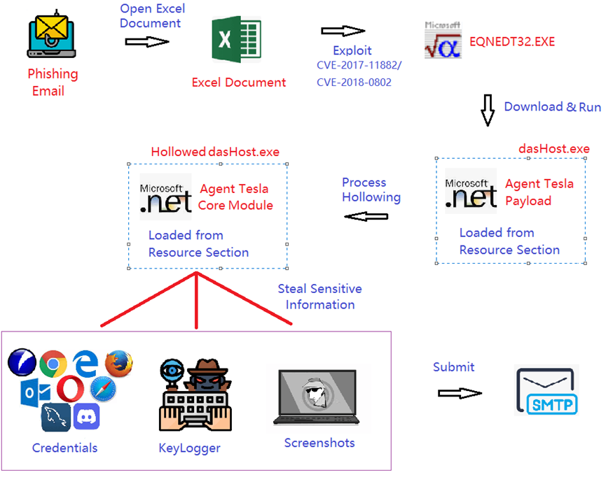 从最初的网络钓鱼电子邮件到安装在受害者计算机上的 Agent Tesla 的操作,再到从受影响的设备收集敏感信息。在本次分析中,将了解该攻击的内容,例如钓鱼邮件如何发起攻击活动、如何利用CVE-2017-11882/CVE-2018-0802漏洞(而非VBS宏)进行下载和攻击。在受害者的设备上执行Agent Tesla文件,以及 Agent Tesla如何从受害者的设备收集敏感数据,例如凭据、按键记录和受害者屏幕截图。