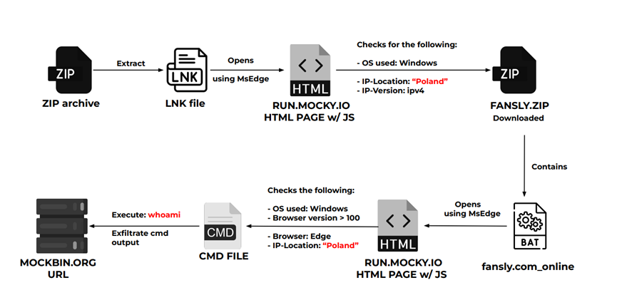 通过对恶意负载的深入分析,发现该活动采用的地理围栏策略,特别关注澳大利亚、波兰和比利时等目标区域。这些操作使用定制的 PowerShell 脚本,目的是在将关键的 NTLM 哈希传输到 Mockbin 平台之前窃取它。该活动的初始阶段涉及部署隐藏在 zip 存档中的 LNK 文件,同时通过战略性地利用 StartUp 文件夹来确保系统内的持久性。此外,收集到的系统信息和 NTMLv2 哈希值是使用 Mockbin API 泄露的。