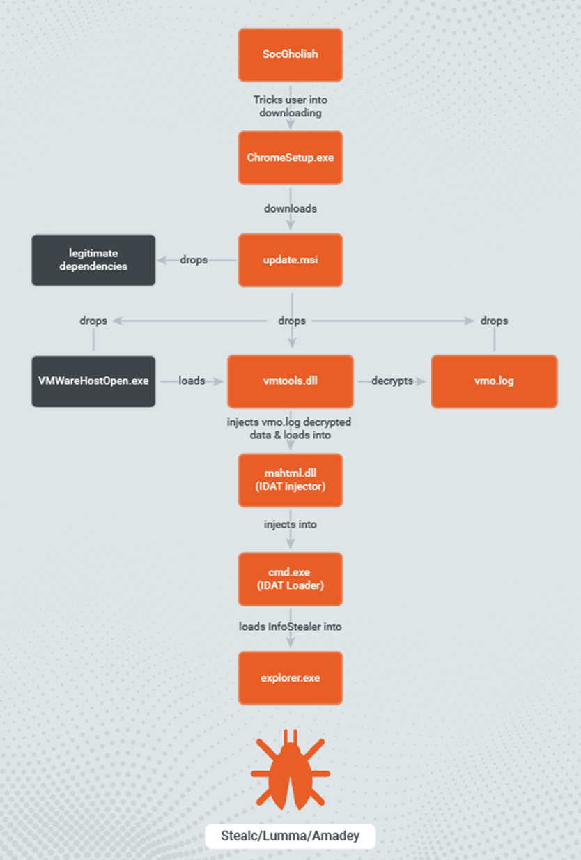 调查显示,IDAT恶意活动始于2023年7月19日,攻击者通过创建虚假浏览器更新页面诱导用户下载了一个名为ChromeSetup.exe的二进制文件,该文件实际上则为ClearFake恶意软件,它将用于下载并安装一个MSI包。执行时,MSI dropper将写入合法的VMwareHostOpen.exe可执行文件、多个合法依赖项以及恶意动态链接库(DLL)文件vmtools.dll。合法的VMWareHostOpen.exe则会从执行VMWareHostOpen.exe的同一目录加载恶意的vmtools.dll,这种技术即称为DLL搜索顺序劫持。IDAT加载程序则被打包到DLL中,采用动态导入方法,由VMWarehost、Python和Windows Defender等合法程序加载。