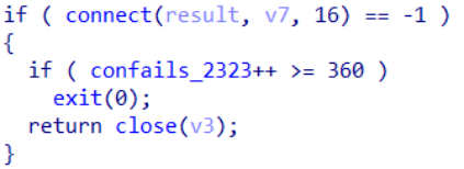 其中一些版本(包含最新传播样本)的样本会尝试连接360次,如果在连接C2服务器360次都失败后样本将自动退出:
