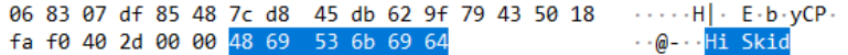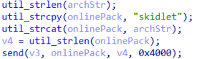 SkidBot 的通信与 Gafgyt 类似,上线包格式为 "(前缀)+架构",在分析时发现了多种前缀,在最新传播的样本中前缀为 "skidlet",同时C2服务器在收到上线包后会进行回复 "HiSkid",这也是该家族命名的由来: