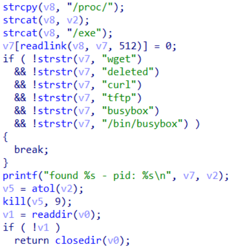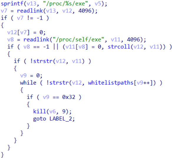 运行后通过读取/proc/中可执行文件的路径信息判断是否为僵尸网络进程并杀死: