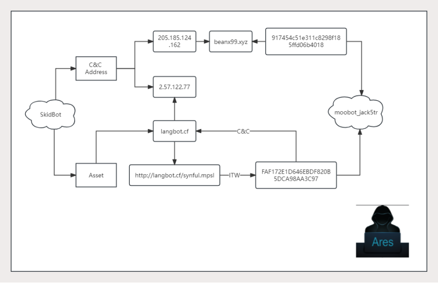 分析 SkidBot 僵尸网络的相关资产,与Ares黑客团伙存在多处重合: