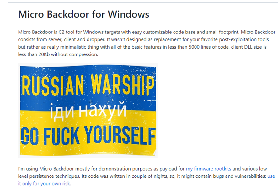 受害者确认后启动vbs释放白加黑套件,最终内存加载MicroBackdoor,该开源项目原本是俄乌冲突的产物,但没想到最后被用来攻击其他国家。