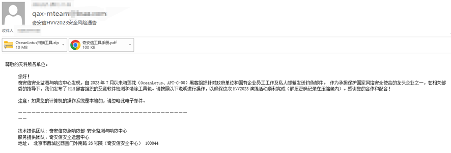 奇安信威胁情报中心在最近的威胁狩猎中捕获到了一封极其抽象的钓鱼邮件,邮件标题为《奇安信HVV2023安全风险通告》,发件人伪造奇安信m-team运营团队向我们的重点客户投递钓鱼邮件,邮件内容为海莲花组织木马的专杀工具和检测文档。这也是我们首次捕获境外APT组织打着“奇安信”名号在演习期间浑水摸鱼,后续经过溯源确认是我们多次在年报中披露的APT-Q-77团伙[1]。