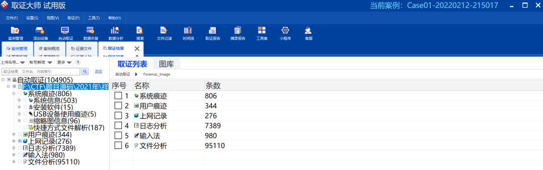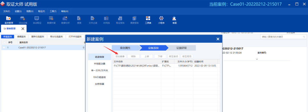 首先点击新建案例,添加镜像文件之后下一步就可以自动取证了。