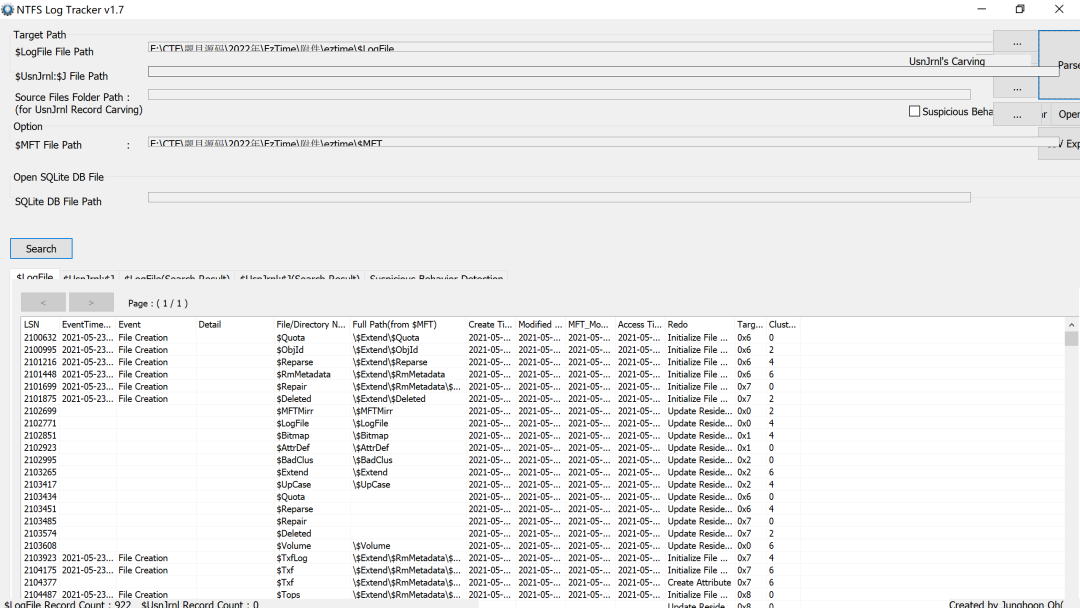 可以使用工具:NTFS Log Tracker 对其进行分析,如2021强网杯的EzTime把$MFT,$LogFile导入之后可以看到相关信息: