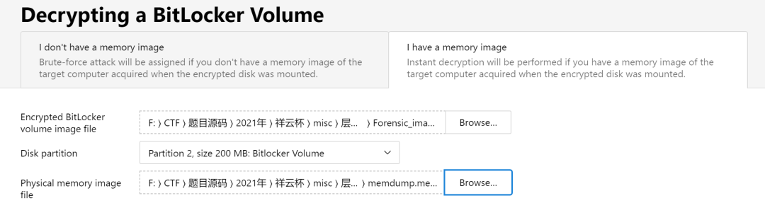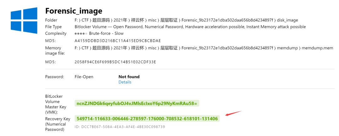 在题目中一般需要通过从内存中提取出恢复密钥,再解密磁盘提取出信息,比如[2021 强网杯]CipherMan,一开始是给了虚拟磁盘文件Secret和一个内存文件memory,首先通过分析内存文件memory获取到BitLocker的恢复密钥如下: