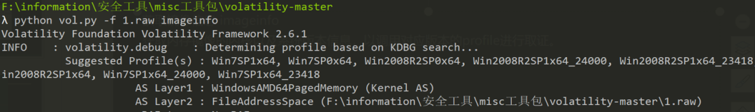 python vol.py -f 文件 imageinfo可以在Suggested Profile处得到系统版本的信息,后续会调用对应版本的profile进行取证。