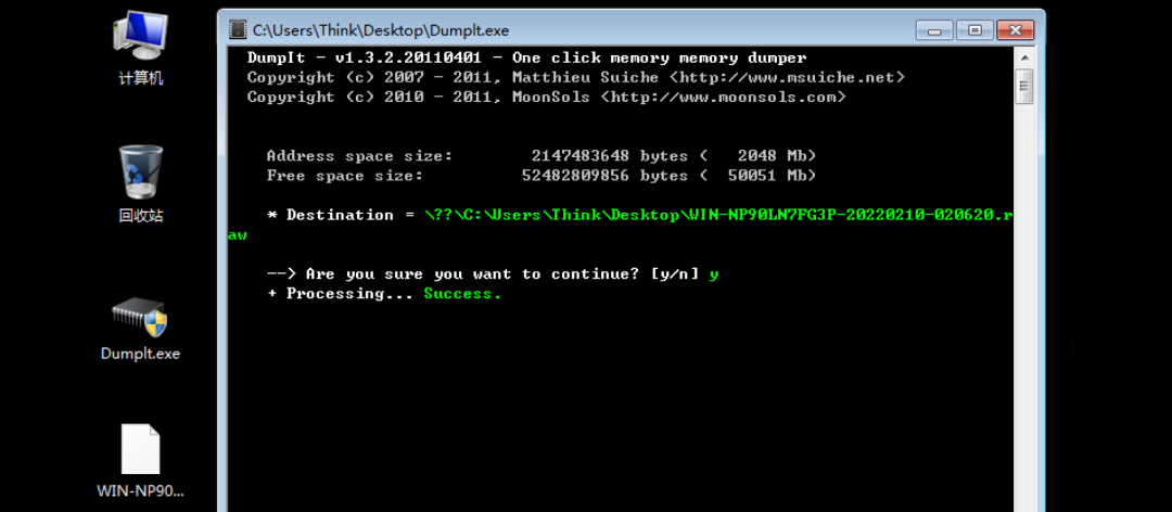 双击DumpIt.exe可执行程序,并在提示问题后面输入y,等待几分钟时间即可在当前目录下生成主机物理内存的副本,该副本文件是以*.raw为后缀的镜像文件,我们取证的对象就是这个内存镜像。