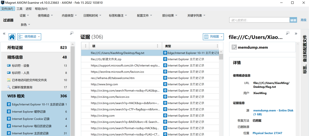 先打开Magnet AXIOM process选择案件详情选择取证文件保存的位置->证据来源->计算机-> Windows ->加载证据->镜像,然后等待分析证据,在分析完成后Magnet AXIOM Examine会弹出并呈现出分析结果。