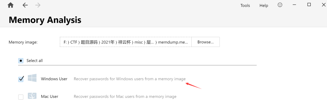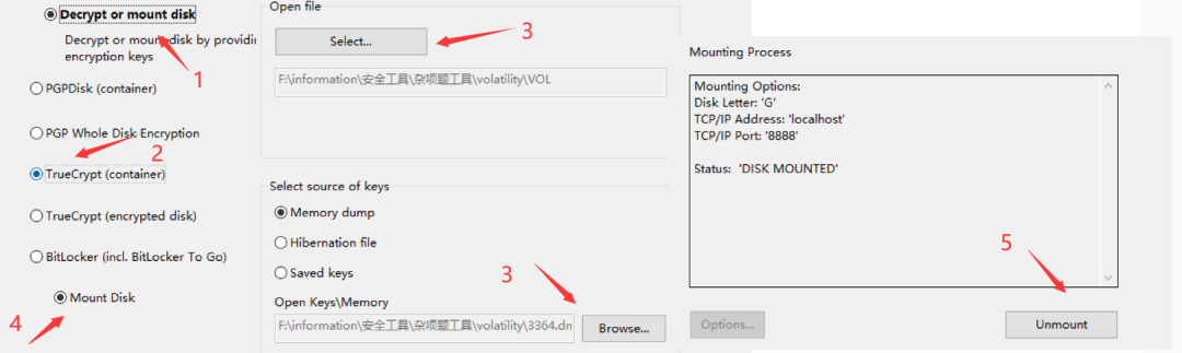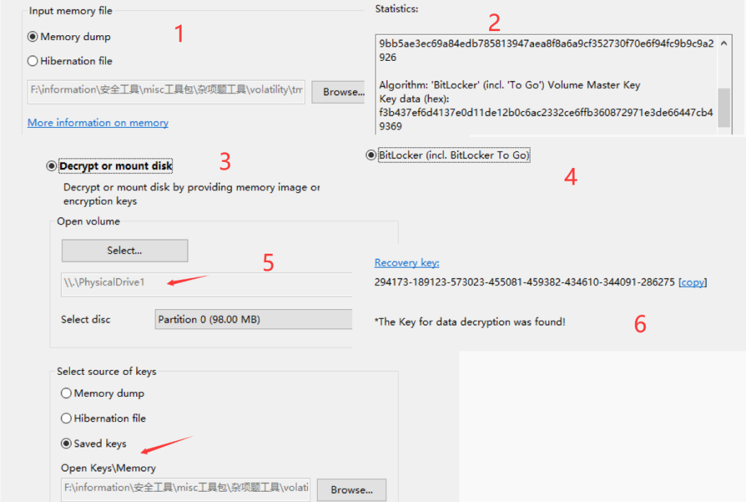 这里以网鼎杯的密码柜为例解开BitLocker的密钥,首先点击Extract keys,选择内存文件memeories.vmem,会解密出一个key,然后点下一步保存为1.evk,点击Decrypt or mount disk选择挂载好的磁盘,再导入1.evk即可。