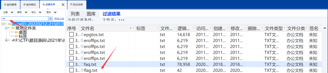 在取证完成之后即可显示取证的结果,并且在证据文件处可以对文件进行搜索,比如搜索txt后缀结尾文件: