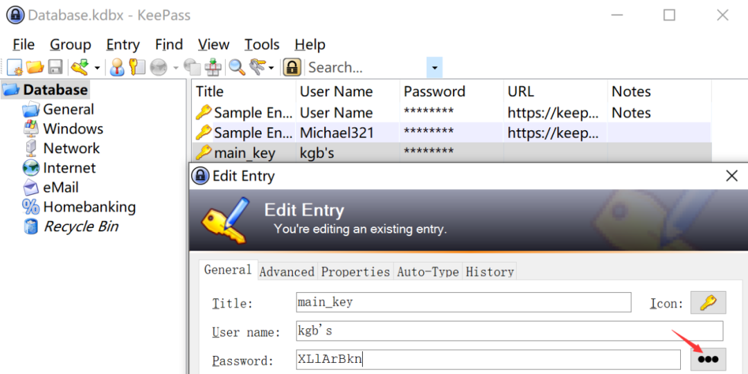 一般来说KeePass的数据库格式是用kdbx后缀结尾的,通常从内存中提取到KeePass的密钥对其进行解密,比如网鼎杯的密码柜题,先用KeePass打开kdbx后缀的文件,然后使用内存中提取的密钥6s4mxkhvge解密即可看到密钥的信息,右键点击Edit Entry即可查看详情: