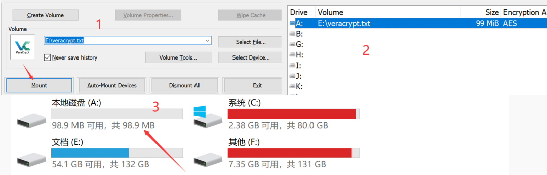 这样加密空间就成功访问,注意创建的veracrypt.txt不要删除,否则加密空间的文件会一起被移除,因为其有挂载功能,所以CTF中解题过程中有时也用veracrypt对卷进行挂载。