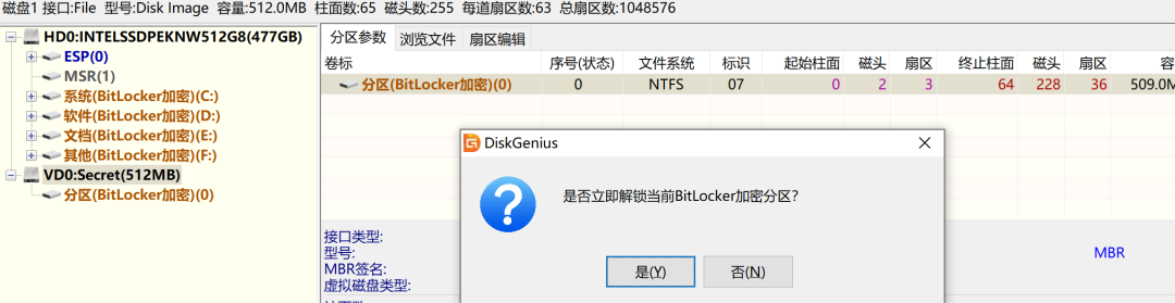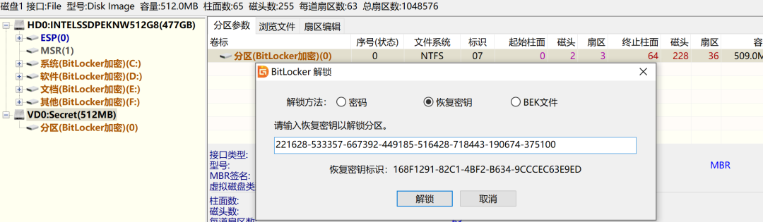 BitLocker : 221628-533357-667392-449185-516428-718443-190674-375100用DiskGenius软件来进行BitLocker的解密,选择磁盘->打开虚拟磁盘文件,选择Secret文件: