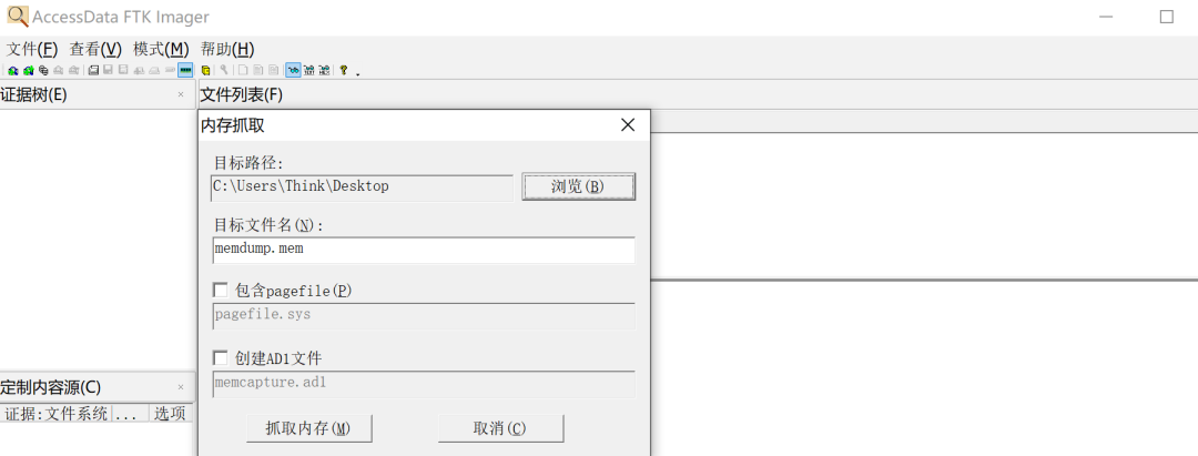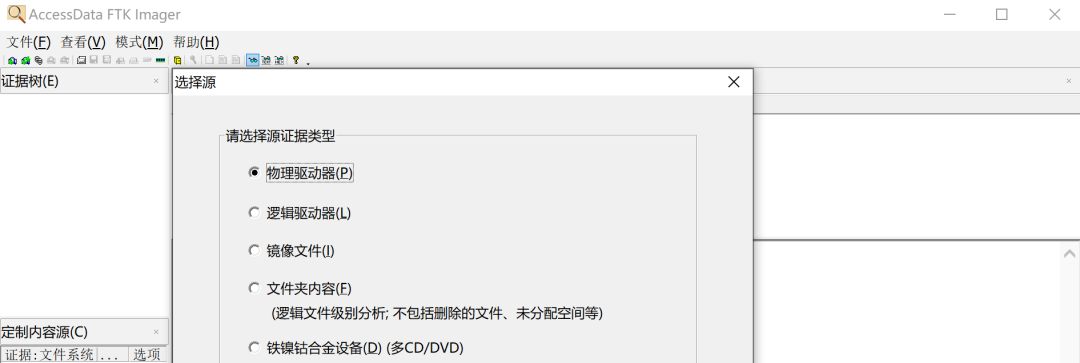 FTK Imager是电子数据取证必备的工具软件,它可以用来制作磁盘镜像,选择文件->创建磁盘镜像。