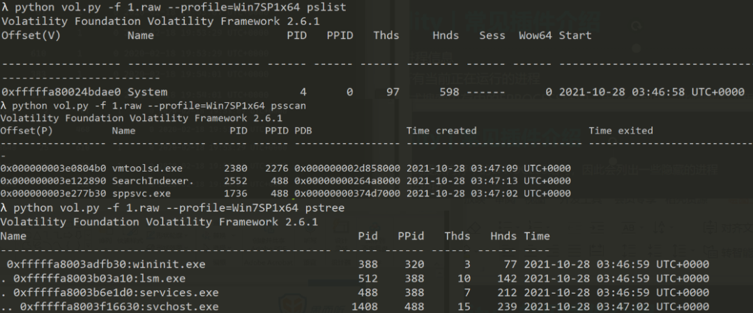 python vol.py -f 文件 --profile=版本 pslist/psscan/pstree一般内存取证的第二步会使用pslist插件列出所有当前正在运行的进程,psscan会启发式搜索内存中的EPROCESS结构,因此会列出一些隐藏的进程,pstree则是以树的形式列出进程。
