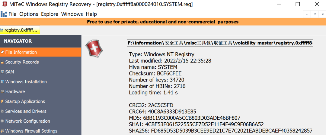 python vol.py -f 文件 --profile=版本 dumpregistry -D 导出地址对于导出来的注册表文件,我们可以用WRR软件或者Registry Explorer对其进行分析,下图是WRR: