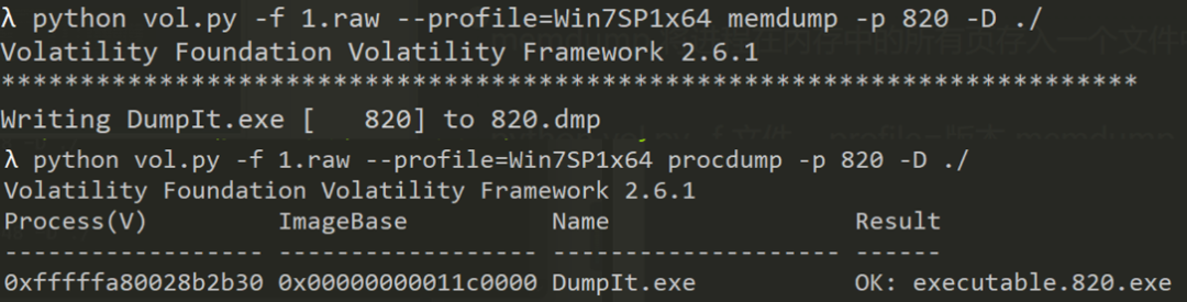 python vol.py -f 文件 --profile=版本 memdump/procdump -p [PID] -D [dump 出的文件保存的目录]memdump可以将进程在内存中的所有页存入一个文件中,procdump则可以获取进程的可执行文件,例如提取PID为820的DumpIt.exe进程。