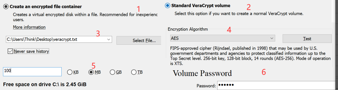 第五步设置的空间加密卷越大,则配置的时间越长,如果要存储4G以上的文件,加密卷格式要选择NTFS,输入密码然后点击格式化即可成功创建加密空间。