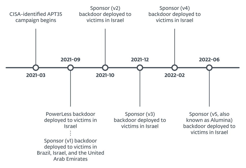近日,ESET的研究人员揭露了一场名为Sponsoring Access的攻击活动。在本次攻击活动中,具有伊朗背景的APT组织——Charming Kitten使用先前未记录的名为Sponsor的后门针对巴西、以色列和阿联酋不同实体的发起了新一波攻击。该组织主要针对教育、政府和医疗保健组织,以及人权活动家和记者。Sponsor后门使用存储在磁盘上的配置文件。这些文件是通过批处理文件谨慎部署的,并故意设计成无害的,从而试图逃避扫描引擎的检测。该活动涉及通过机会性地利用暴露于互联网的Microsoft Exchange服务器中的已知漏洞来执行妥协后的操作,从而获得初始访问权限,这与澳大利亚、英国和美国于2021年11月发布的建议相呼应。在研究人员详细介绍的一起事件中,据称一家经营保险市场的身份不明的以色列公司于2021年8月被对手渗透,以提供下一阶段的有效载荷,例如PowerLess、Plink和基于Go的开源后利用程序Merlin。攻击活动时间表如下图所示。