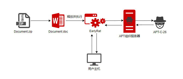 具有朝鲜背景的APT组织Lazarus Group其下的Andariel子组织自2009年以来一直活跃,主要对韩国实体进行破坏性和以经济利益为动机的网络攻击。近期,Kaspersky的研究人员揭示了Andariel组织的新恶意攻击组件:EarlyRat。为深入了解其行为模式,360的安全研究人员对此进行了进一步的调查,并成功追踪到了EarlyRat的最新活动踪迹。根据追踪,攻击者疑似首先借助Skype聊天工具向受害者发送了诱饵文件下载链接,之后再诱导受害者通过谷歌浏览器下载了含有恶意文档的压缩文件。一旦受害者打开含有恶意文档的压缩文件,攻击者将继续利用伪装成Microsoft信息的恶意文档,诱使受害者运行恶意宏代码,进而释放EarlyRat远控木马,最终窃取用户信息并执行恶意命令。其中,EarlyRat基于PureBasic框架编写,设计较为简洁,但能够高效地执行攻击者下发的命令和执行文件。这意味着攻击者能够利用EarlyRat在受害者的计算机上进行一系列的远程操作,从简单的系统监控到复杂的数据窃取或者更进一步的系统破坏。攻击链图如下图所示。