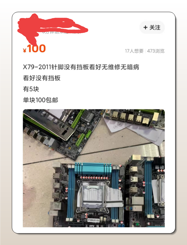 由于我们需要把总价压倒300元,所以主板只能选择杂牌x79,随便买,只要完好能用就行了,要啥自行车,记得要2011针脚的哦,不然用不了2660 v2,闲鱼多淘一淘就可以淘到100元左右的x79啦,说不定老板还送点东西呢(风扇、内存条啥的)。