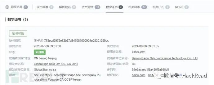 通过网络空间测绘发现2291个独立IP,进行验证确定均为百度所属TLS证书,如果单从通信流量来看是比较难判断是否为恶意通信的,而上面针对域前置+C2前置流量设施的TLS证书进行了伪造,成功对空间测绘与威胁情报实现了干扰,造成了错误的信息关联,使得攻击者的流量特征更加逼真,实现了伪造正常通信流量的目的。
