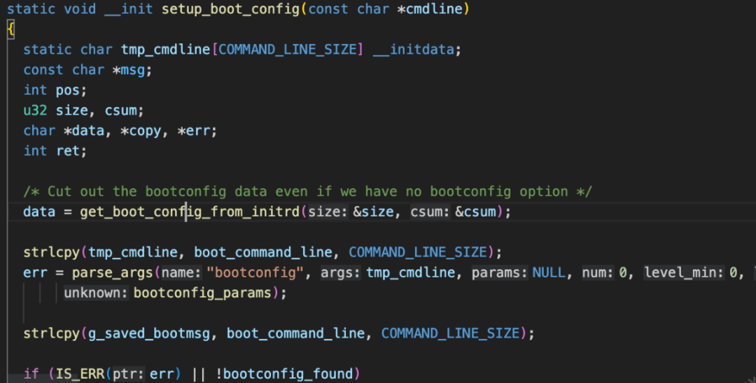 kernel版本 5.10.168 路径/common/fs/proc/bootconfig.c中的proc_boot_config_init函数初始化了/proc/bootconfig的输出,顺着全局变量xbc_data找到系统获取bootconfig的地方/common/init/main.c -> setup_bootconfig, 可以看到bootconfig是从initrd里拿的。