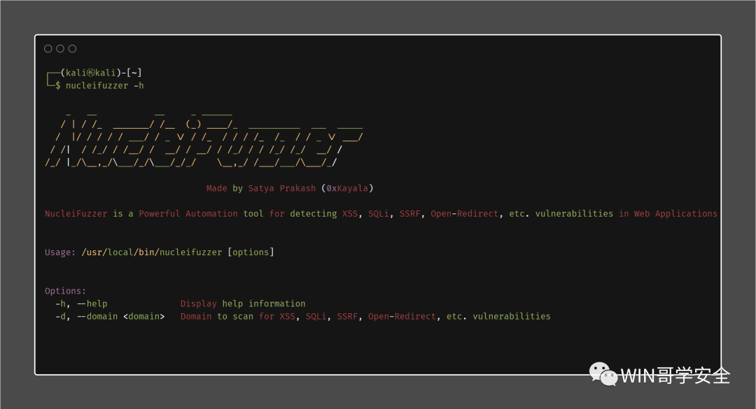 nucleifuzzer -hNucleiFuzzer is a Powerful Automation tool for detecting XSS, SQLi, SSRF, Open-Redirect, etc. vulnerabilities in Web ApplicationsUsage: /usr/local/bin/nucleifuzzer [options]Options:-h, --help Display help information-d, --domain <domain> Domain to scan for XSS, SQLi, SSRF, Open-Redirect..etc vulnerabilities