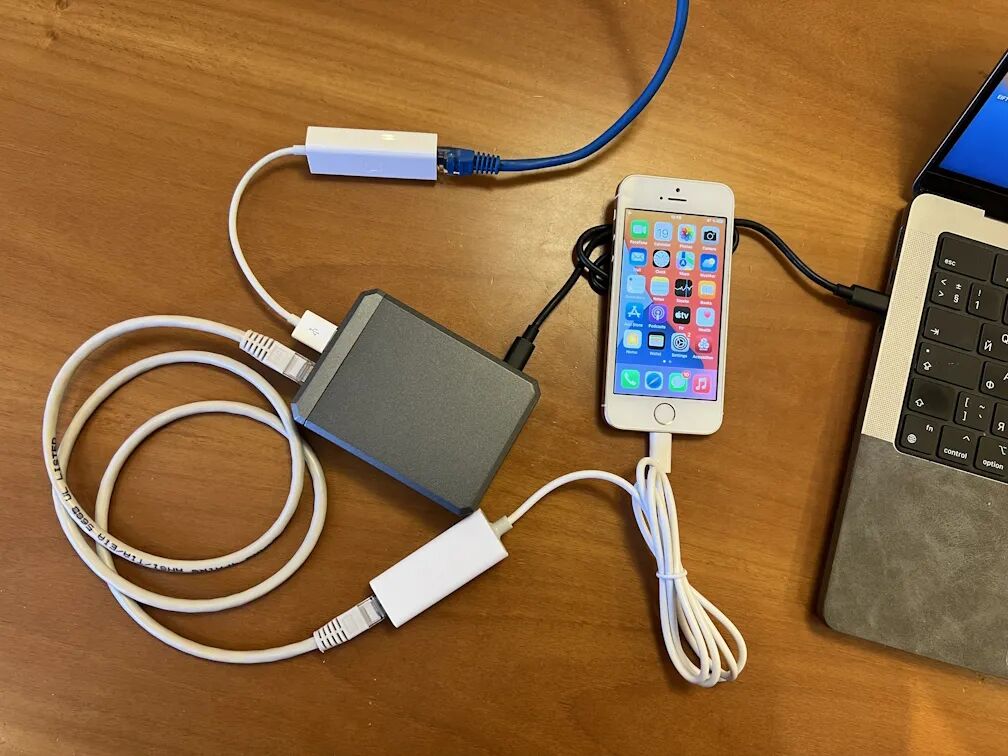 您需要在树莓派上安装两个网络接口。一个接口将连接到互联网,另一个连接iPhone。连接iPhone需要一个Lightning转以太网适配器。