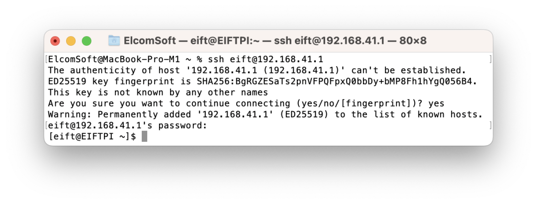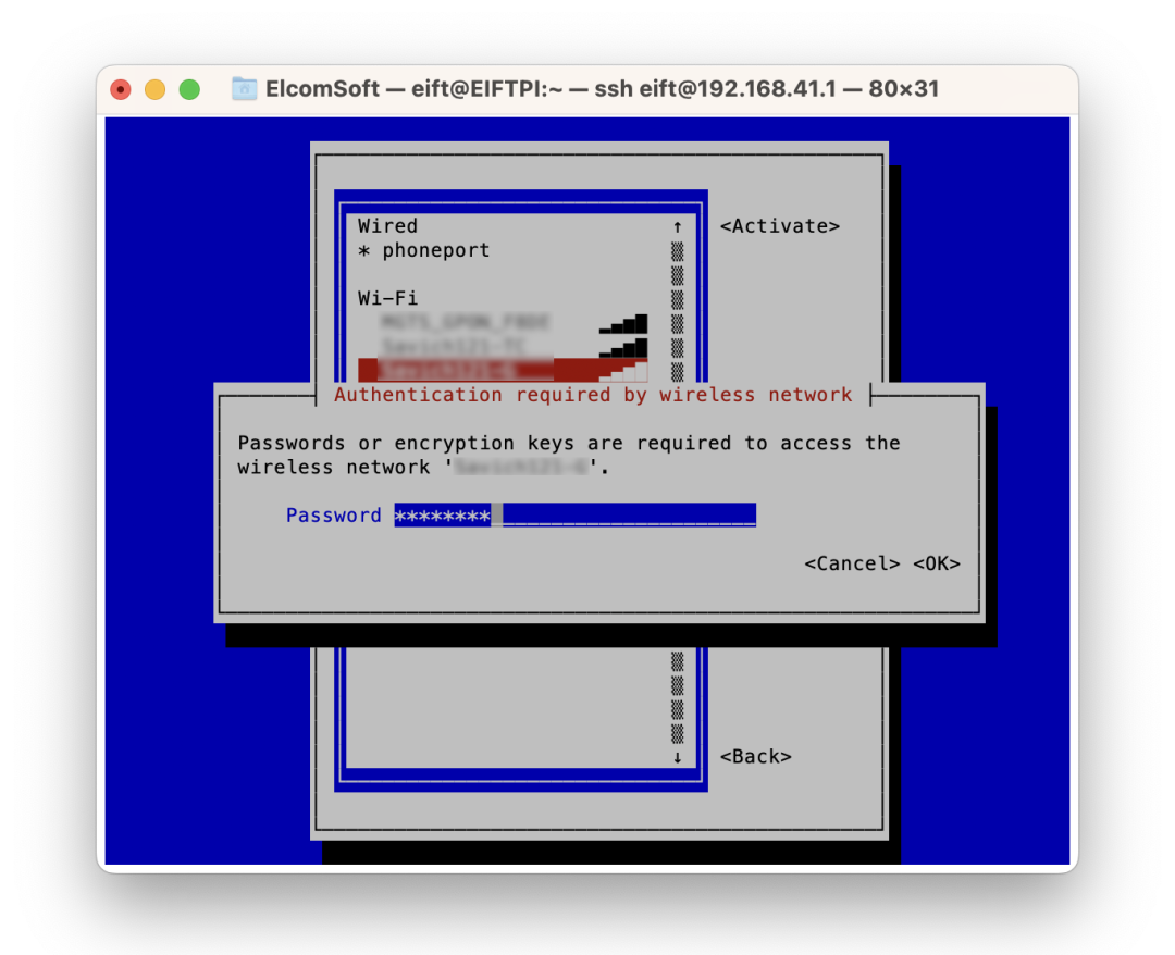 您现在已经使用固件设置了树莓派。将Pi连接到网络(通过以太网或Wi-Fi),并使用数据线将您的iPhone连接到Pi。注意:我们建议首先使用测试iPhone,以确保互联网访问受到限制,只能访问ppq.apple.com、humb.apple.com和elcomsoft.com。