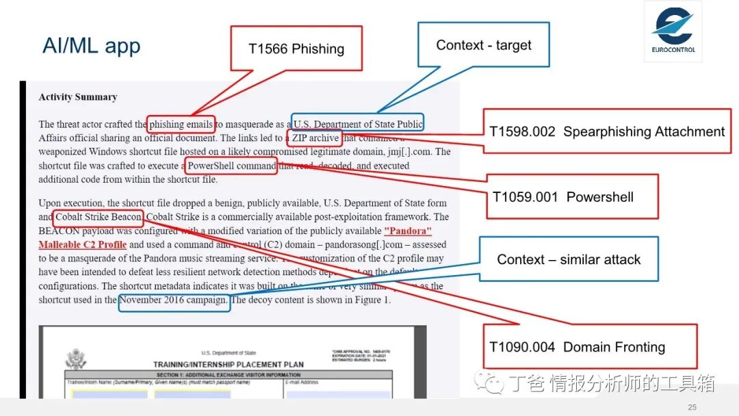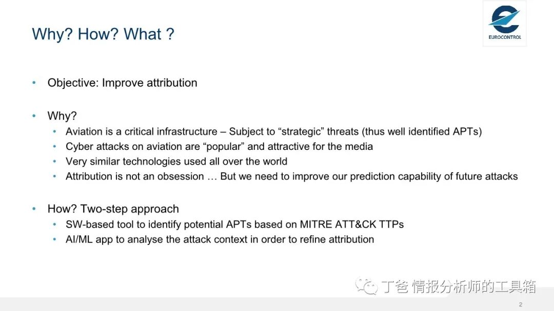 航空是重要的基础设施-易受到“战略”威胁(因此能够很好识别APT组织)归因不是一种执念……但我们需要提高对未来袭击的预测能力基于sw的工具,根据MITRE攻击和ck TTPs识别潜在的apt人工智能/机器学习(AI-ML)应用程序分析攻击上下文,以细化归因![]()