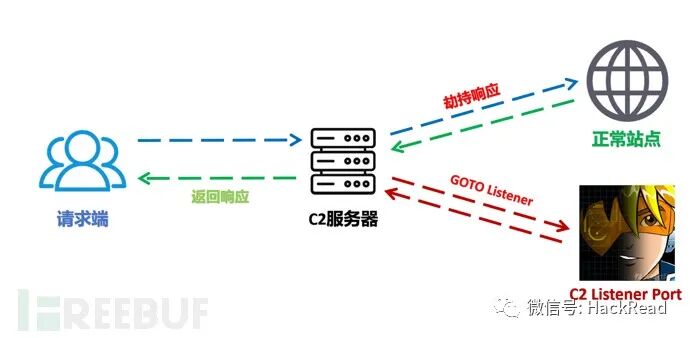 相信不少读者对劫持响应会比较感兴趣,大概原理为当客户端对真实的C2服务器发起请求时,由于不符合入站规则,所以C2服务器会获取指定的正常站点并返回其响应信息,所以从效果请求端来看好像是与该IP进行服务交互,但是实际是以中间C2服务器为代理服务器与正常站点进行交互,很难发现异常。而如果符合入站请求时,则会将流量请求转发至真实的C2服务监听端口进行交互,而真实监听端口已经被云防火墙过滤,仅允许本机访问,从外部是无法直接访问的。所以从外部端口开放情况来看仅开放了该HTTP/S端口,而某种意义来说这也确实为C2的上线端口。