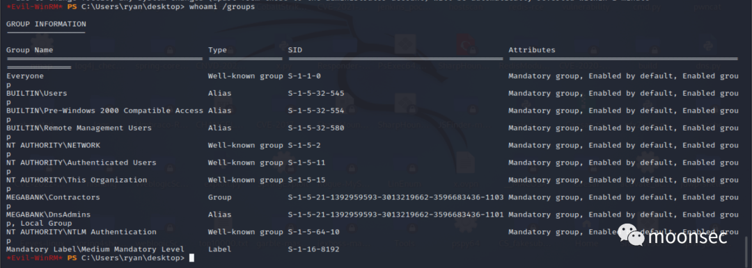 发现登录的 ryan 用户是 DnsAdmins 组的一部分